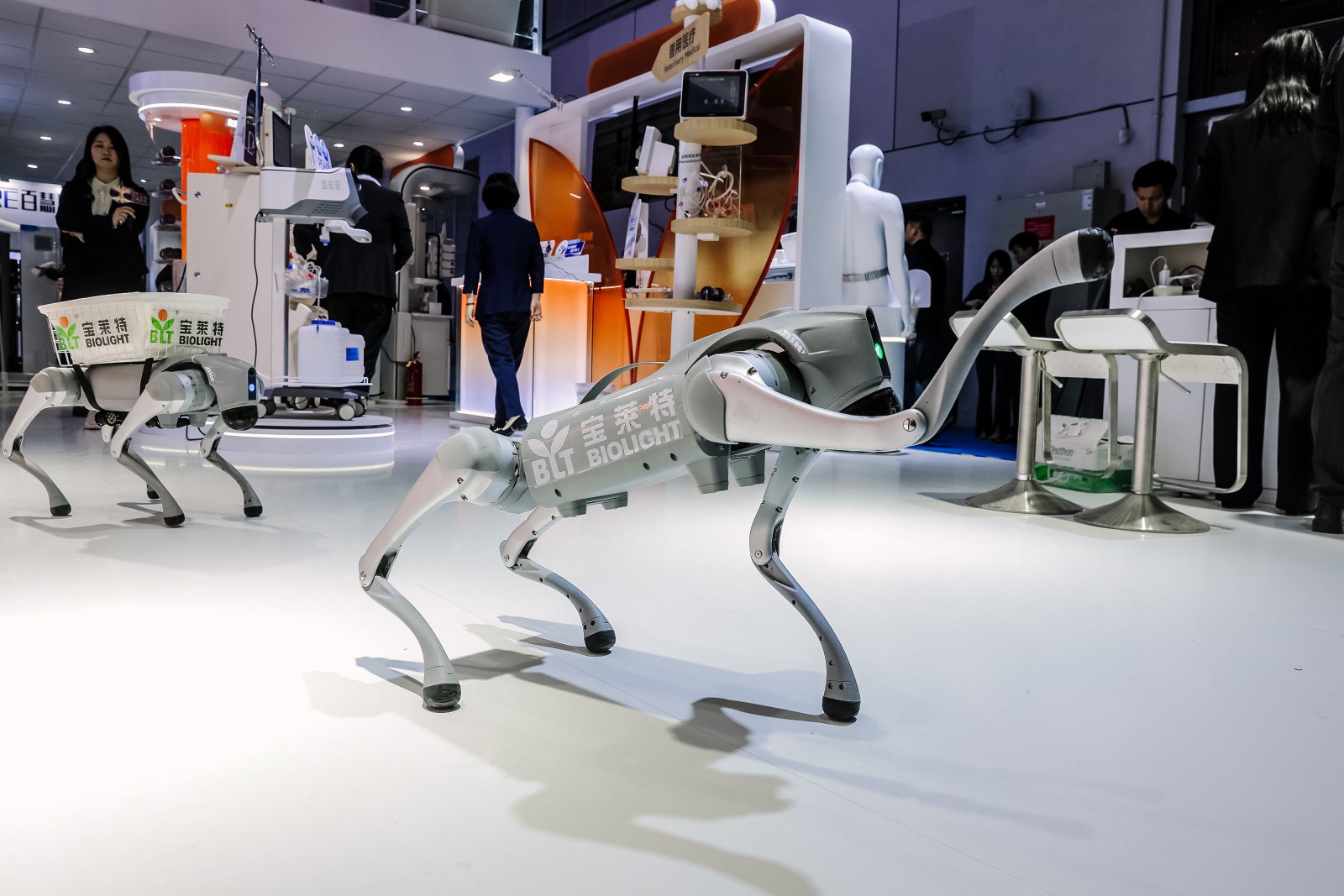 工业级四足机器人搭载一竞技官网转运监护仪、遥测系统、心电图机及急救一体机,现场演示其在急救救援中的灵活应用。其自主导航避障系统可适应楼梯、坡道等复杂地形,吸引现场众多观众驻足。