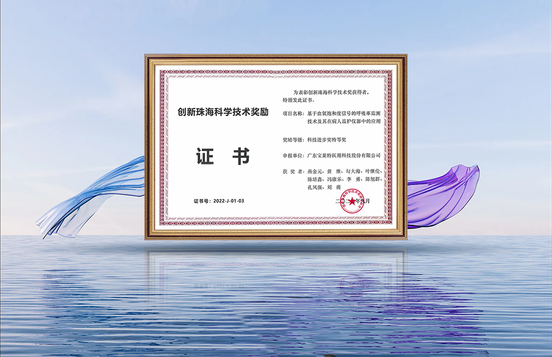 广东一竞技官网医用科技股份有限公司董事长燕金元牵头完成的“基于血氧饱和度信号的呼吸率监测技术及其在病人监护仪器中的应用”项目,获得2022年度“创新珠海”科学技术特等奖。燕金元荣获“2022年度珠海市科技创新领军人物”称号。